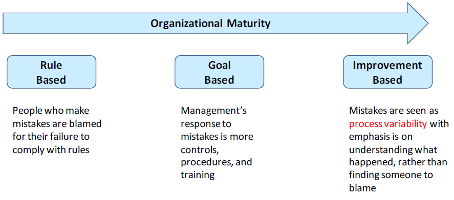 - Goal Based –Safety becomes an organizational goal. Management’s response to mistakes is to pile on more broadly enforced controls, procedures and training with little or no performance rationale or basis for the changes.
