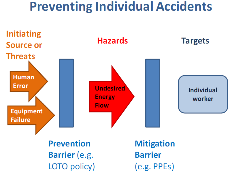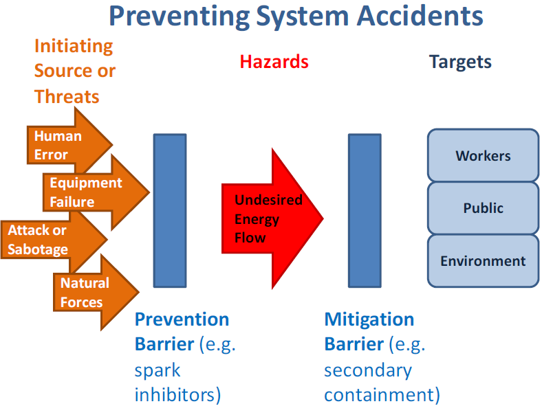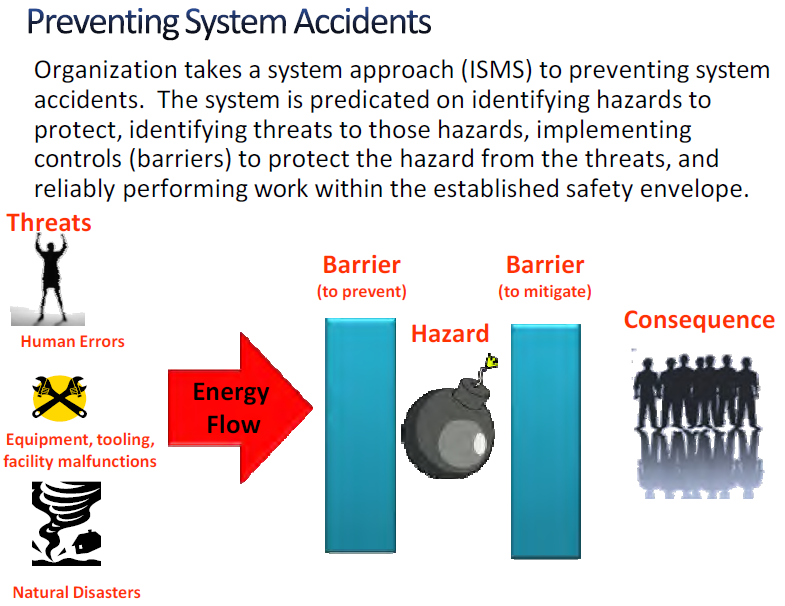 Figure 1-10 provides a simplistic view of how to prevent a system accident. Hazards can be energy in the form of leaks, projectiles, explosions, venting, radiation, collapses, or other ways that produce harm to the work force, the surrounding community, or the environment. The idea is that one wants to isolate these hazards from those things that would threaten to release the unwanted energy or material, such as human errors, faulty equipment, sabotage, or natural disasters such as wind and lightning through the use of preventive barriers. If this is done, work can proceed safely (accidents are avoided).