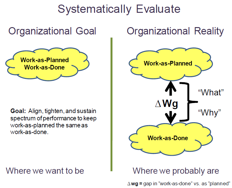 There will always be a performance gap between “work-as-planned” and “work-as-done” work performance gap (ΔWg) because of the variability in the execution of every human activity (right side of Figure 1-11). When the ΔWg becomes a problem because an accident or an information-rich, high-consequence or reoccurrence event occurs, a systematic investigative process helps to understand first “what” the variation is and second, determine “why” the variation exists. Figure 1-11 illustrates the comparison of the ideal or desirable organizational work performance goal on the left side, with the more likely or realistic work performance gap on the right. Recognizing and reducing the gap is the objective of “Provide Feedback and Continuous Improvement” activities.