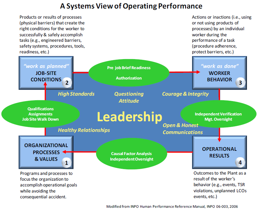 The High Level Model for examining organizational drift, shown in Figure 1-13, was adapted from work by the Institute of Nuclear Power Operations (INPO)vii . It is intended to represent a systematic view for analysis of both individual and system accidents. The model breaks down work into four sequences that one typically finds at sites: 1) Organizational Processes & Values; 2) Job Site Conditions (work-as-planned); 3) Worker Behaviors (“work-as-done”); 4) Operational Results. An explanation of each category of work can be found in Figure 1-13.