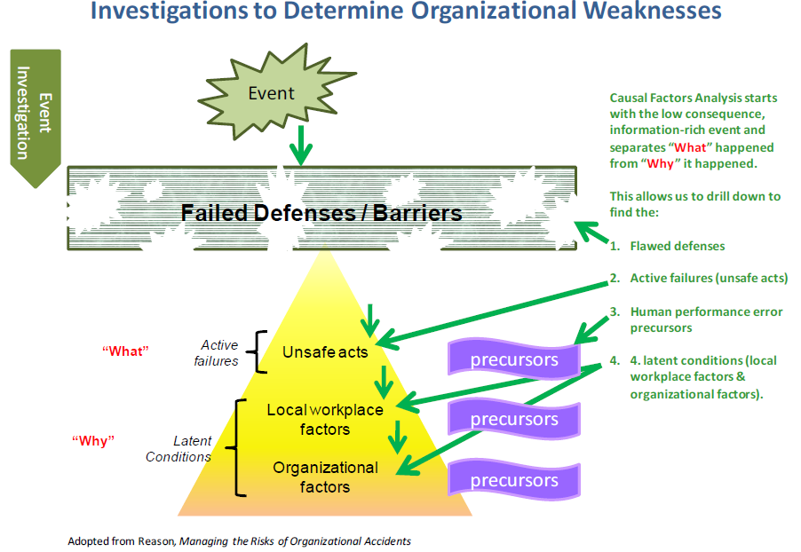 - Investigations require delving into the basic organizational processes: designing, constructing, operating, maintaining, communicating, selecting, and training, supervising, and managing that contain the kinds of latent conditions most likely to constitute a threat to the safety of the system.