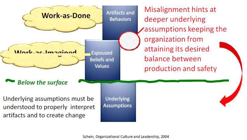 An organization’s culture, if not properly aligned with safety requirements, could result in ignored safety requirements. A healthy culture exists when the “work-as-done” (culture artifacts and behavior) overlap the “work-as-planned” (espoused beliefs and values) indicating an alignment with the underlying assumptions (those factors felt important to management). A misalignment between actual safety behavior and espoused safety beliefs indicates an unhealthy culture or one in which the employees are not buying into the established safety system or one in which the true underlying assumptions of management is focused on something besides safety (Figure 1-15).