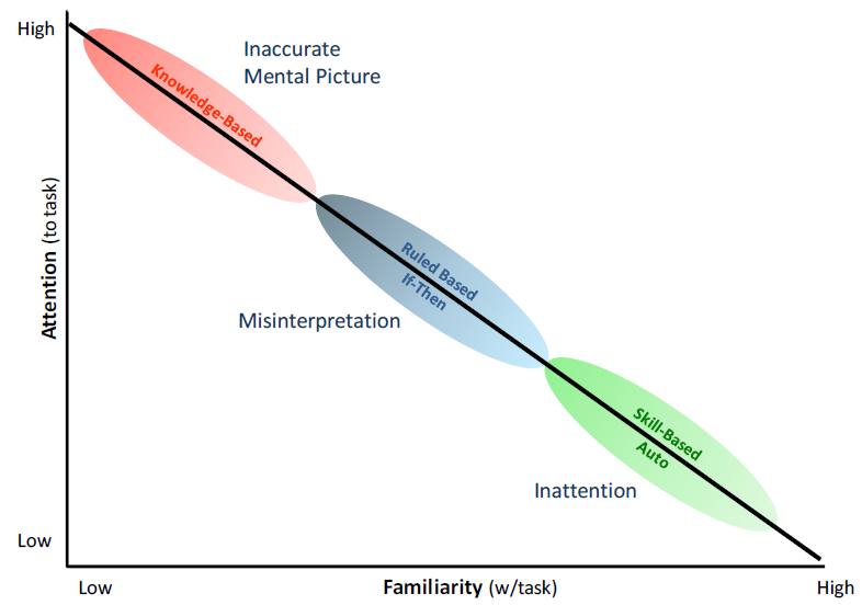- Knowledge mode – Actions in response to an unfamiliar situation. This could be new task or a previously familiar task that has changed in an unanticipated manner. Rather than using known rules, the worker is trying to reason or even guess their way through the situation. Errors can be as frequent as 1 in 2, literally a coin flip.