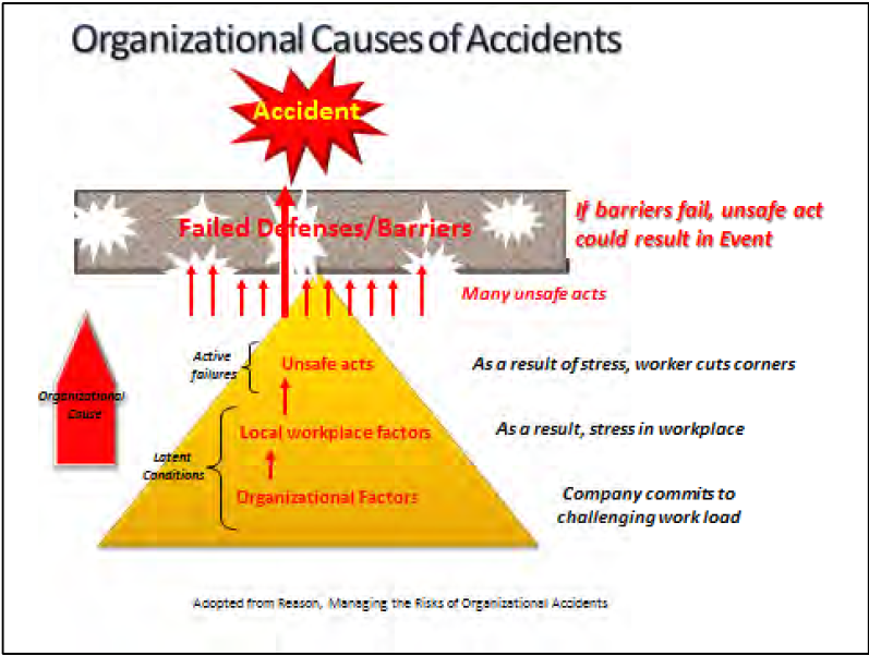 - The “why” things did not work according to plan comes from a cultural-based assessment of the organization to understand why the employees thought it was OK to do what they did at the time in question. Establishing the “why” tends to be a backwards regression identifying the assumptions, motives, impetus, changes and inertia within the organization that may reveal weaknesses and inadequacies of the barriers, barrier selection, and maintenance processes. The objective is to understand the latent organizational weaknesses and cultural factors that shaped unacceptable outcomes.