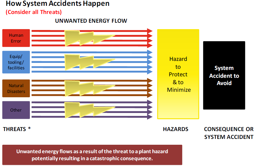Step #3- Recognize Threat Posed by Human Errors, Failed Equipment, Tooling or Facilities, Mother Nature (i.e., natural disasters) or Other as of yet Unknown Things: A key component of consequence avoidance is identifying and minimizing all significant knowable threats that could challenge the hazard (i.e., allow the flow of unwanted energy). Note the use of the word “all.” The intent is that if not all threats are identified and addressed; the organization is vulnerable to failure. Organizations should ensure the system event does not occur, not hope it does not occur (i.e., they prove operations safe).