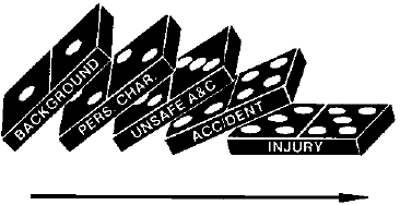This is a simple, linear cause and effect model where accidents are seen thee natural culmination off a series of events or circumstances, which occur in a specific and recognizable order. The model is often represented by a chain with a weak link or a series of falling dominos. In this model, accidents are prevented by fixing or eliminating the weak link, by removing a domino, or placing a barrier between two dominos to interrupt the series of events. The Domino Theory of Accident Causation developed by H.W. Heinrich in 1931 is an example of a sequence of events model. [Heinrich, 1931]13