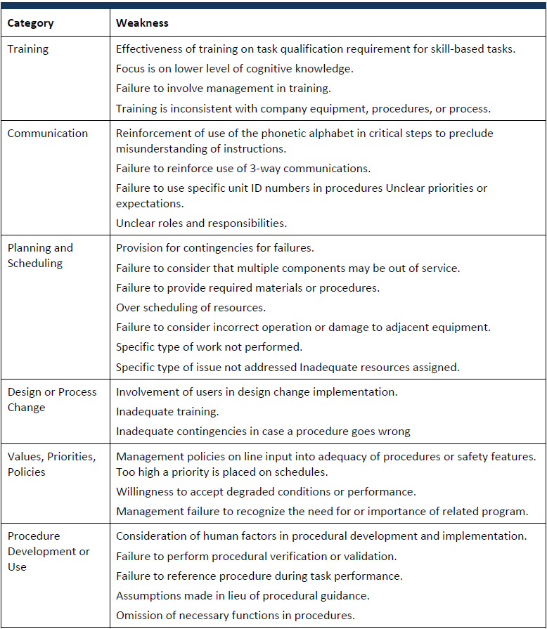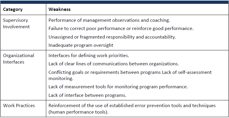 Table 1-1 is a guide, to help identify latent organizational weaknesses – those factors in the management control processes or associated values that influence errors or degrade defenses. Consider work practices, resources, documentation, housekeeping, industrial safety, management effectiveness, material availability, oversight, program controls, radiation employee practices, security work practices, tools and equipment use, training and qualification, work planning and execution, and work scheduling. For an expanded list of examples, see Attachment 1, ISM Crosswalk and Safety Culture Lines of Inquiry.
