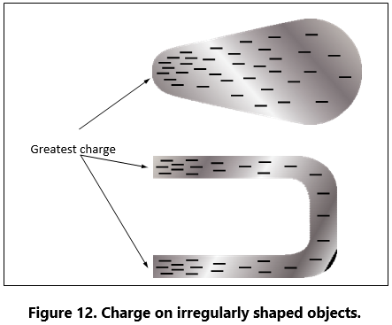 The distribution of the charge on an irregularly shaped object differs from that on a regularly shaped object. Figure 12 shows that the charge on such objects is not evenly distributed. The greatest charge is at the points, or areas of sharpest curvature, of the objects.