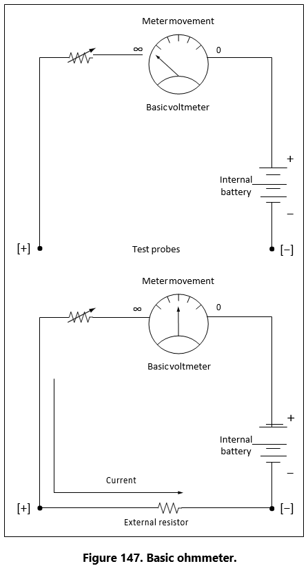 The ohmmeter is used to measure the resistance. In its more basic form, the ohmmeter consists of a variable resistor in series with a meter movement and a voltage source. The meter must first be adjusted before use.