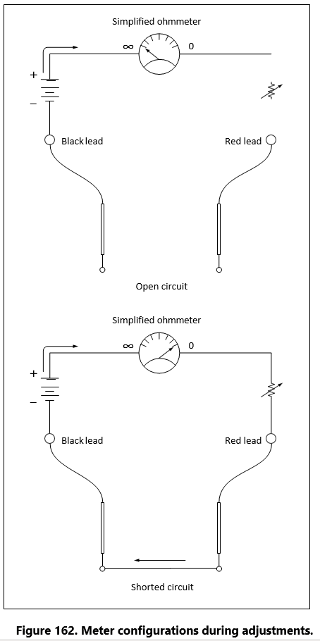 Refer to Figure 162 for meter configurations during adjustments. When the meter leads are not connected (open), the needle will point to the full left-hand position, indicating infinite resistance or and open circuit. With the lead placed together, the circuit is shorted as shown with the meter needle to the full right-hand position. When a connection is made, the internal battery is allowed to produce a current through the movement coil, causing a deflection of the needle in proportion to the value of the external resistance. In this case, the resistance is zero because the leads are shorted.