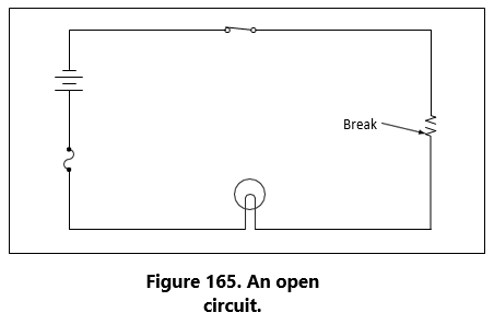 - Open circuit — a circuit that is not a complete or continuous path. An open circuit represents an infinitely large resistance. Switches are common devices used to open and close a circuit. Some- times a circuit will open due to a component fail- ure, such as a light bulb or a burned out