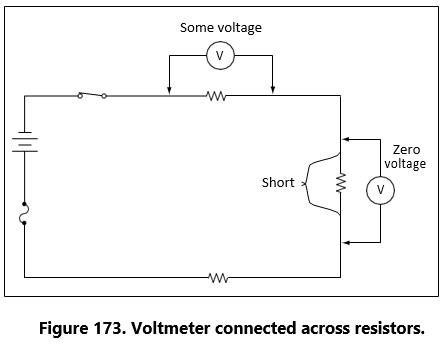 To locate the shorted resistor while the circuit is functioning, a voltmeter can be used. Figure 173 illustrates that when a voltmeter is connected across any of the resistors, which are not shorted, a portion of the applied voltage will be indicated on the voltmeter scale. When it is connected across the shorted resistor, the voltmeter will read zero.