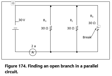 The procedures used in troubleshooting a parallel circuit are sometimes different from those used in a series circuit. Unlike a series circuit, a parallel cir- cuit has more than one path in which current flows. A voltmeter cannot be used, since, when it is placed across an open resistor, it will read the voltage drop in a parallel branch. But an ammeter or the modified use of an ohmmeter can be employed to detect an open branch in a parallel circuit.