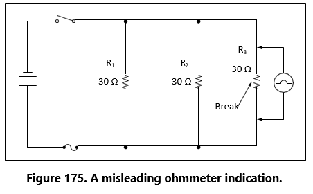 A modified use of the ohmmeter can also locate this type of open. If the ohmmeter is connected across the open resistor, as shown in Figure 175, an erroneous reading of continuity would be obtained. Even though the circuit switch is open, the open resistor is still in parallel with R1 and R2, and the ohmmeter would indicate the open resistor had a resistance of 15 ohms, the equivalent resistance of the parallel combination of R1 and R2.