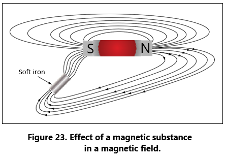 Reluctance, the measure of opposition to the lines of force through a material, can be compared to the resistance of an electrical circuit. The reluctance of soft iron, for instance, is much lower than that of air. Figure 23 demonstrates that a piece of soft iron placed near the field of a magnet can distort the lines of force, which follow the path of lowest reluctance through the soft iron.